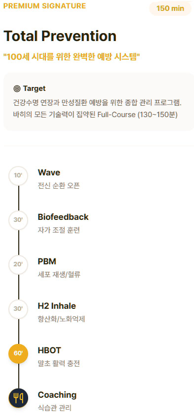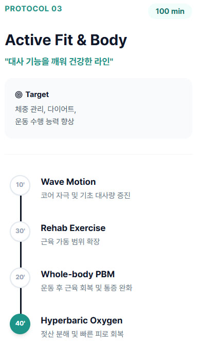 혈액순환을 먼저 열고(Wave), 근육과 신경을 조율한 뒤(Rehab), 세포를 재생하고(PBM), 독소를 비우고(Hydrogen), 생명을 채우는(Oxygen) 최적의 순서로 설계되었습니다.